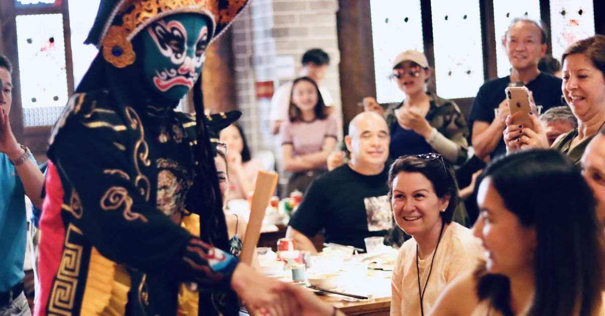 (Western visitors experiencing the Hot-pot and Face-changing of Sichuan Opera)